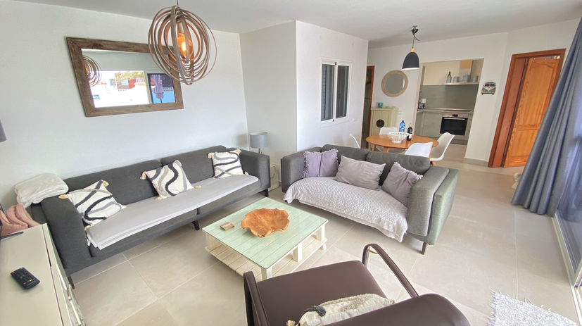 • Obývacia miestnosť s gaučom a jedálenským stolom